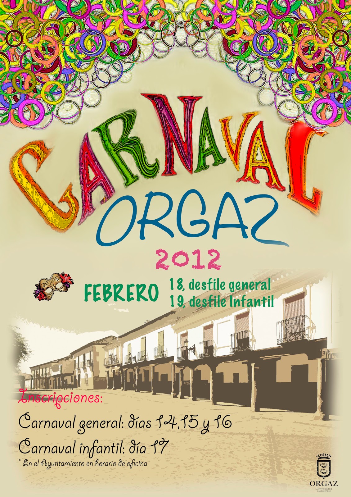 Desde el Ayuntamiento estamos ya preparándolo todo para que la celebración del Carnaval 2012 sea un éxito del que participen todos los vecinos de Orgaz. Hemos comenzado elaborando el cartel anunciador, donde os damos a conocer las fechas para la inscripción y el desfile. Próximamente publicaremos también las bases de participación. No te quedes atrás y ve preparando ya tu disfraz.